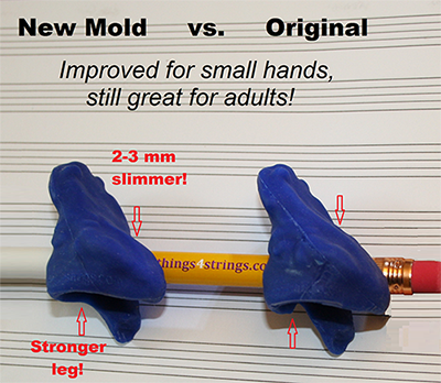 We have now moved to a Version 2.0 mold for our Frog Frog™ index finger/thumb shaper (of the popular 2-piece Bow Hold Buddies® set.)