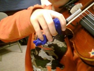 This is one of my students (age 5, 1/8 size violin) with your nifty device!